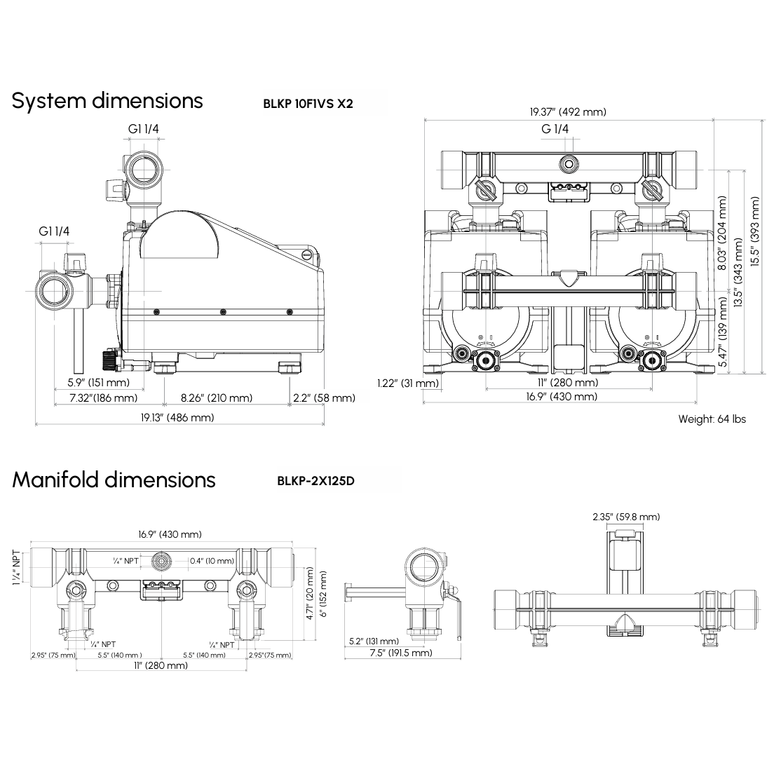 Max Amp (per pump): 9.0/4.6 **To correctly size the electrical protection, please consider that when BLACKPEARL 2X is working at full capacity (both units in operation) the max current could be 18A when powered at 115V and 9.2A when powered at 230V.